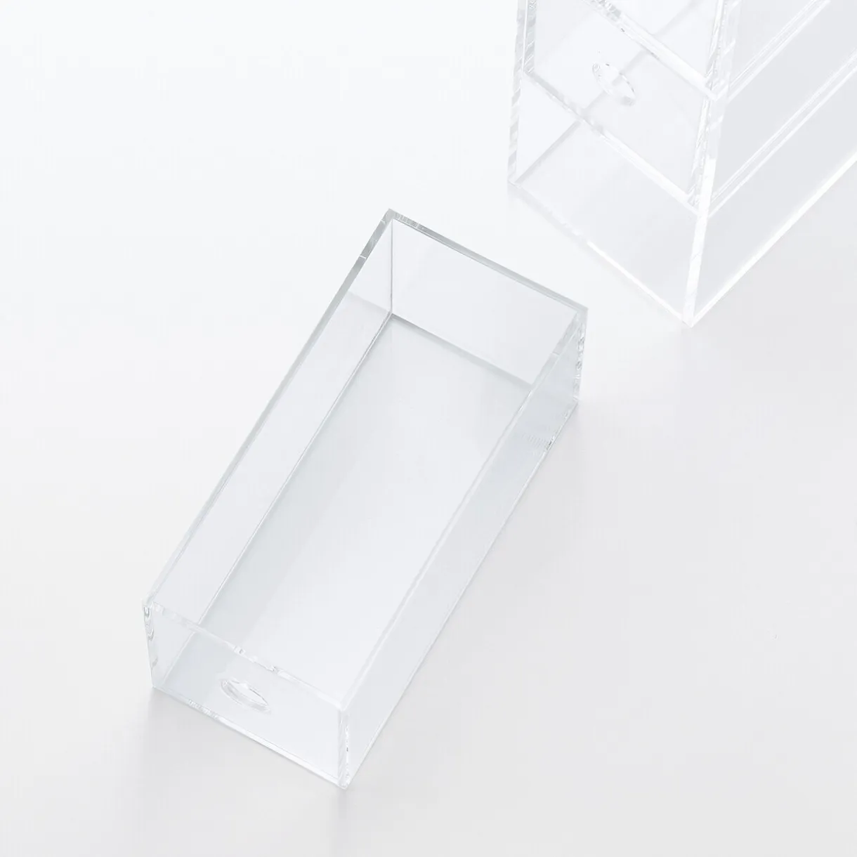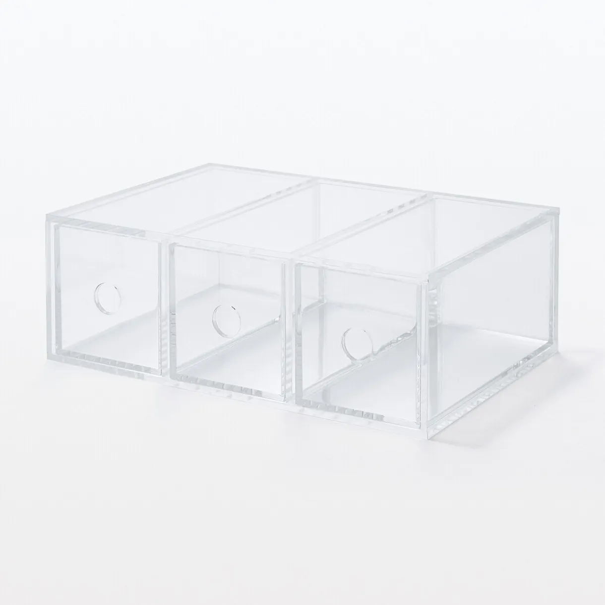 Compartiment en acrylique 3 tiroirs. Peut être utilisé verticalement ou horizontalement.Position verticale : largeur 8.6cm x longueur 17cm x hauteur 25.2cm.