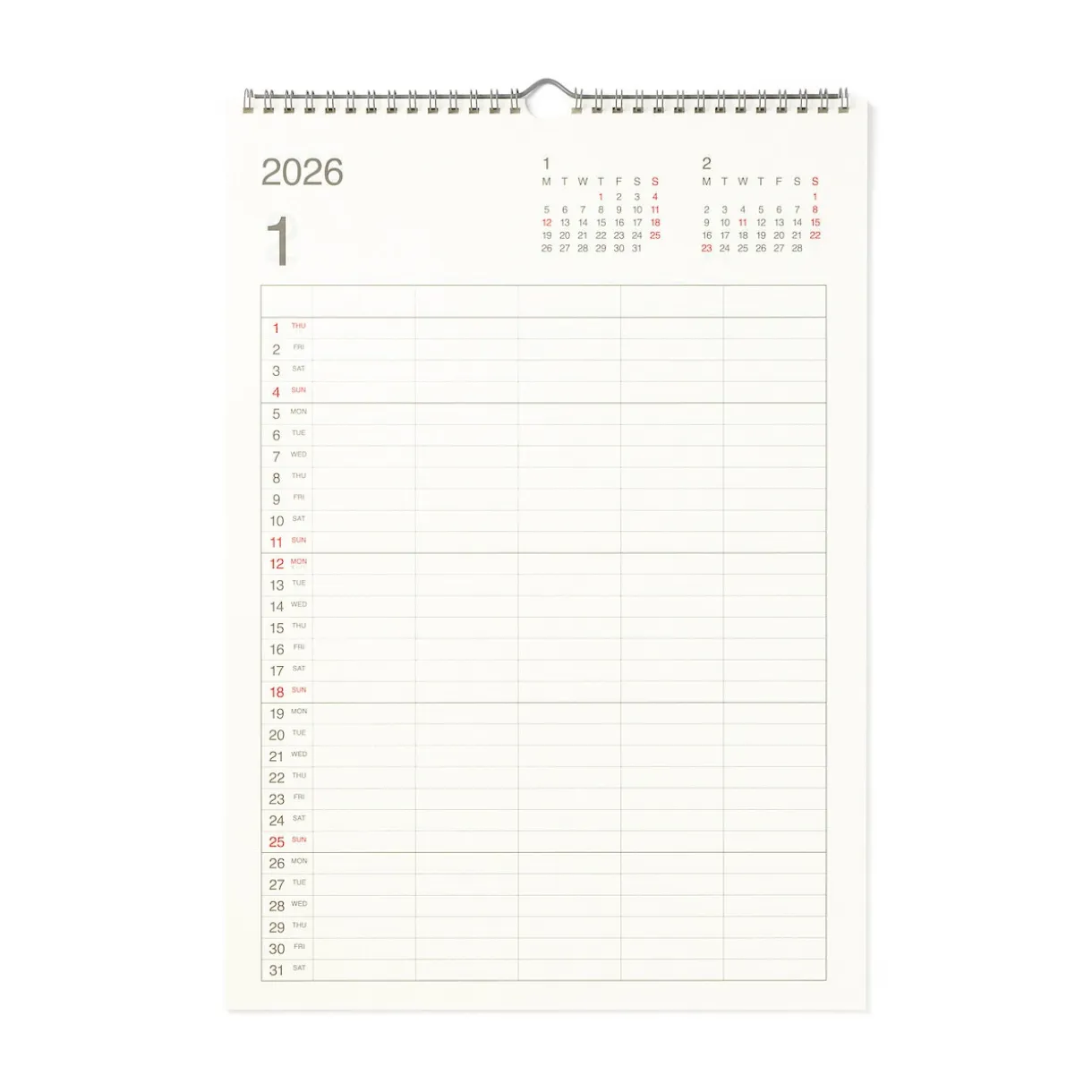 Tout le monde sur la même longueur d’onde. Un calendrier mural familial au format A3 fabriqué à partir de papier bagasse, un sous-produit de la canne à sucre. Il couvre la période de janvier à décembre 2026 et comporte cinq colonnes permettant de visualiser les emplois du temps de chacun en un seul coup d’œil. Il est livré avec un crochet pour l’accrocher au mur.