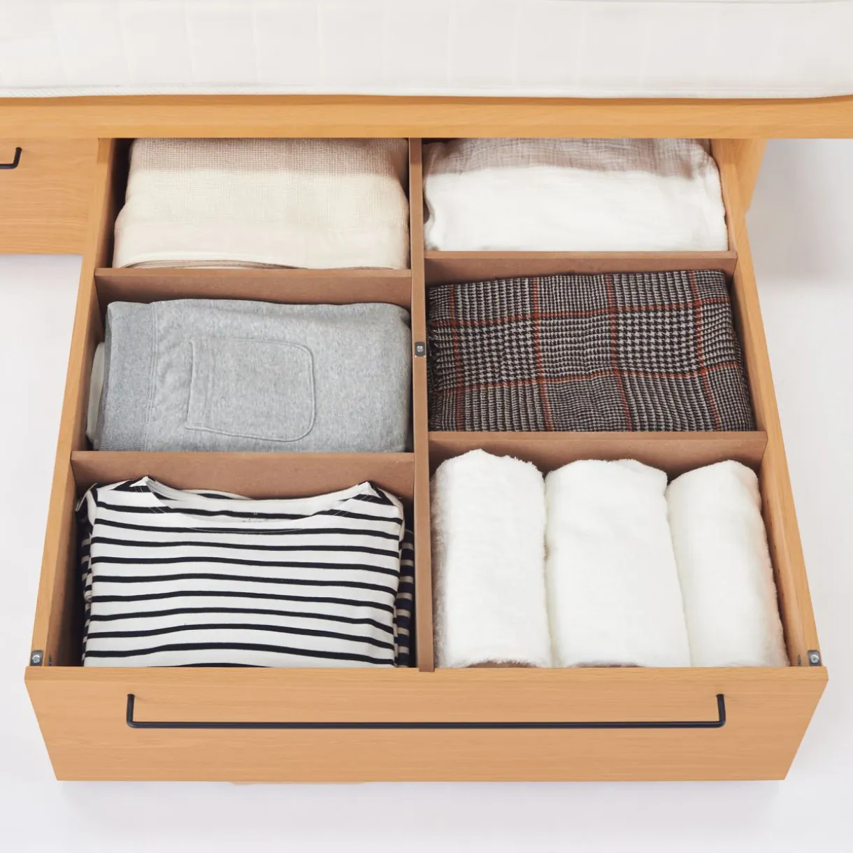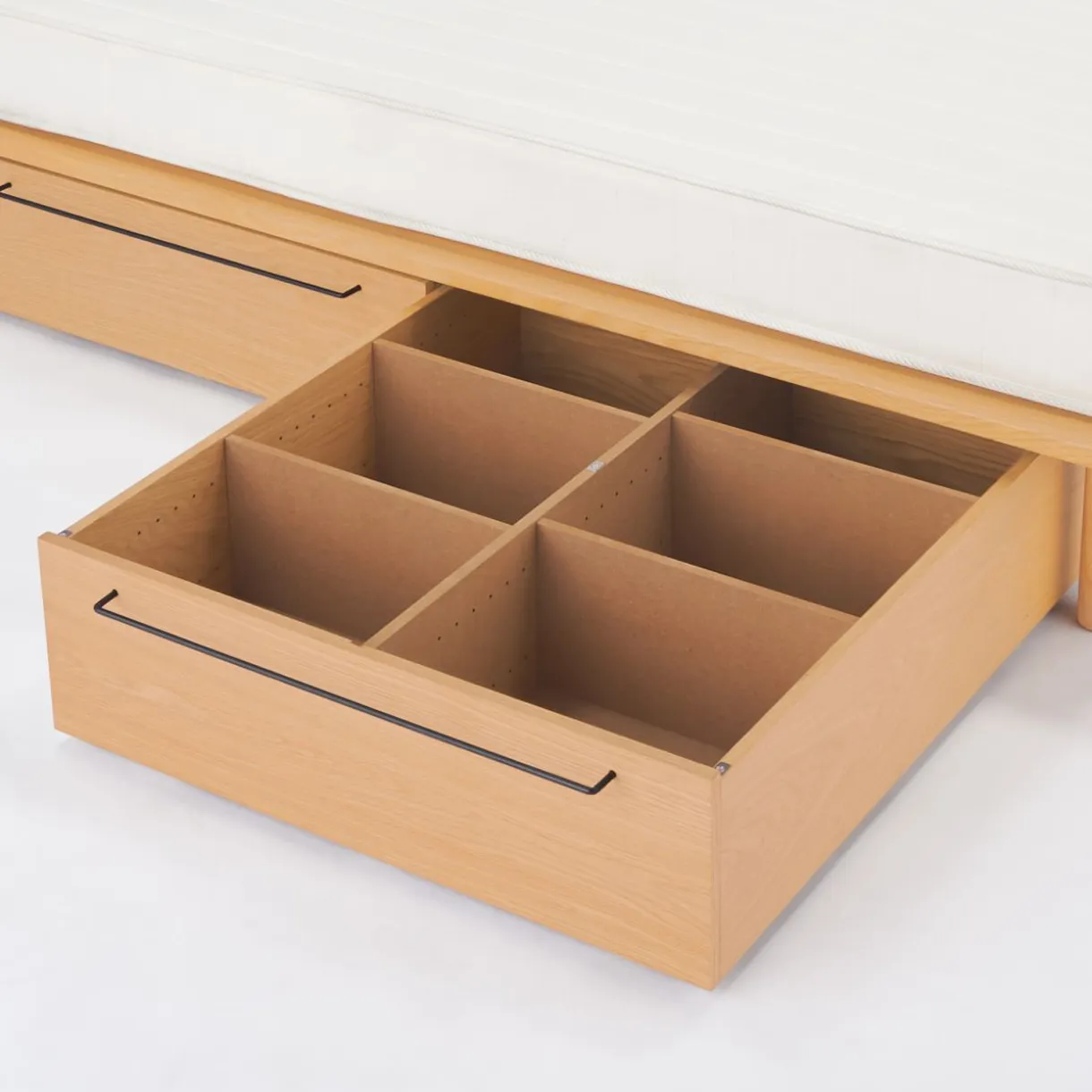 Rangement de dessous de lit, adapté aux lits avec des pieds de 26 cm. Les roues facilitent l’utilisation des boîtes de rangement. Avec des séparateurs amovibles pour adapter l’espace de rangement à la taille des objets.Dimensions: