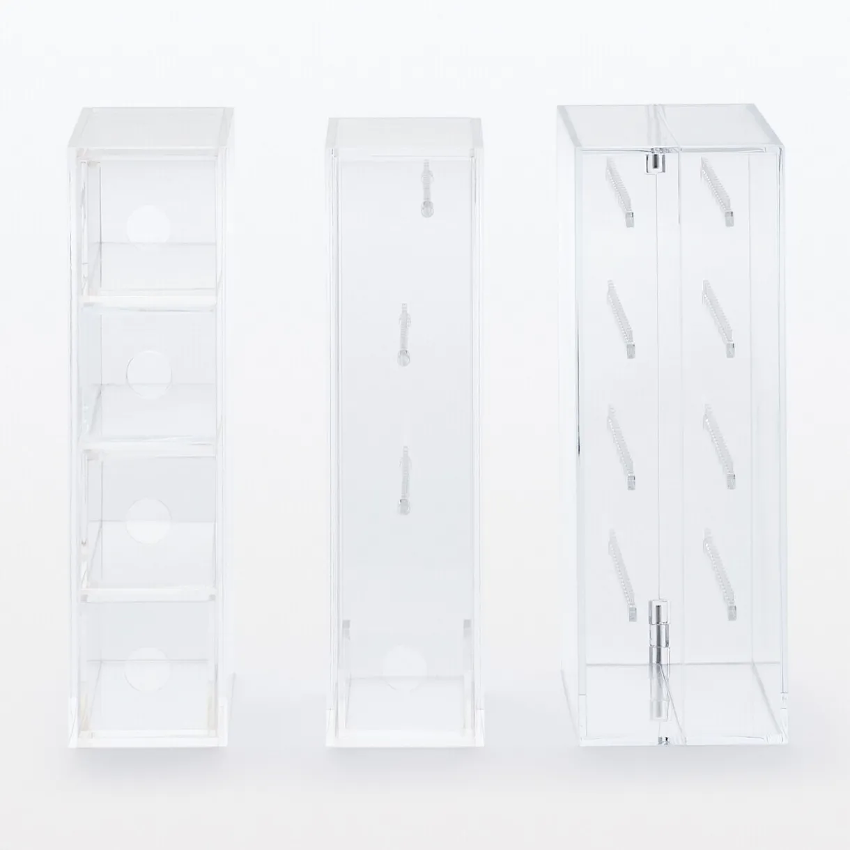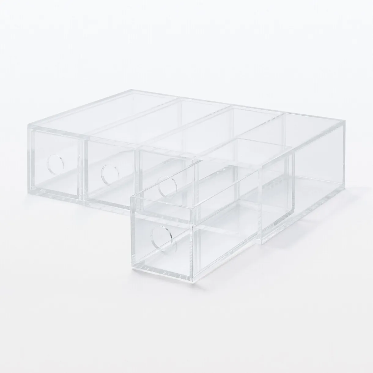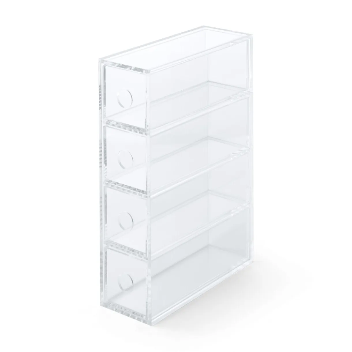 6.7 x 17.5 x 25cm. Boîte en acrylique 4 tiroirs, utilisable verticalement ou horizontalement. Idéale pour les lunettes, elle peut être utilisée également pour des pinceaux à maquillage, des articles de mercerie ou de couture, des crayons.