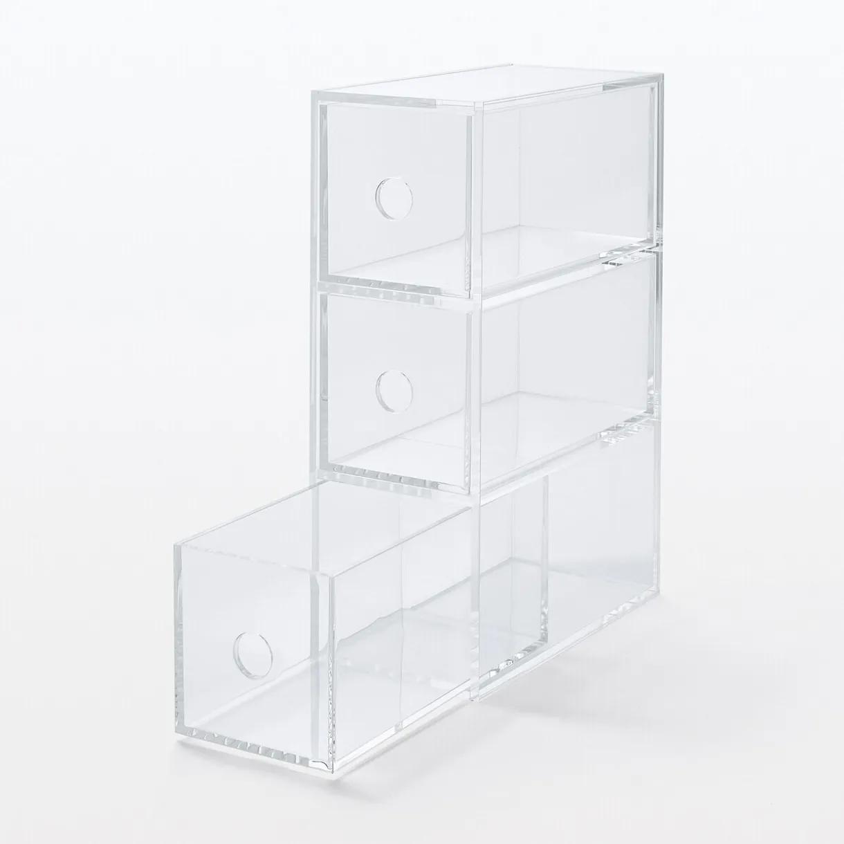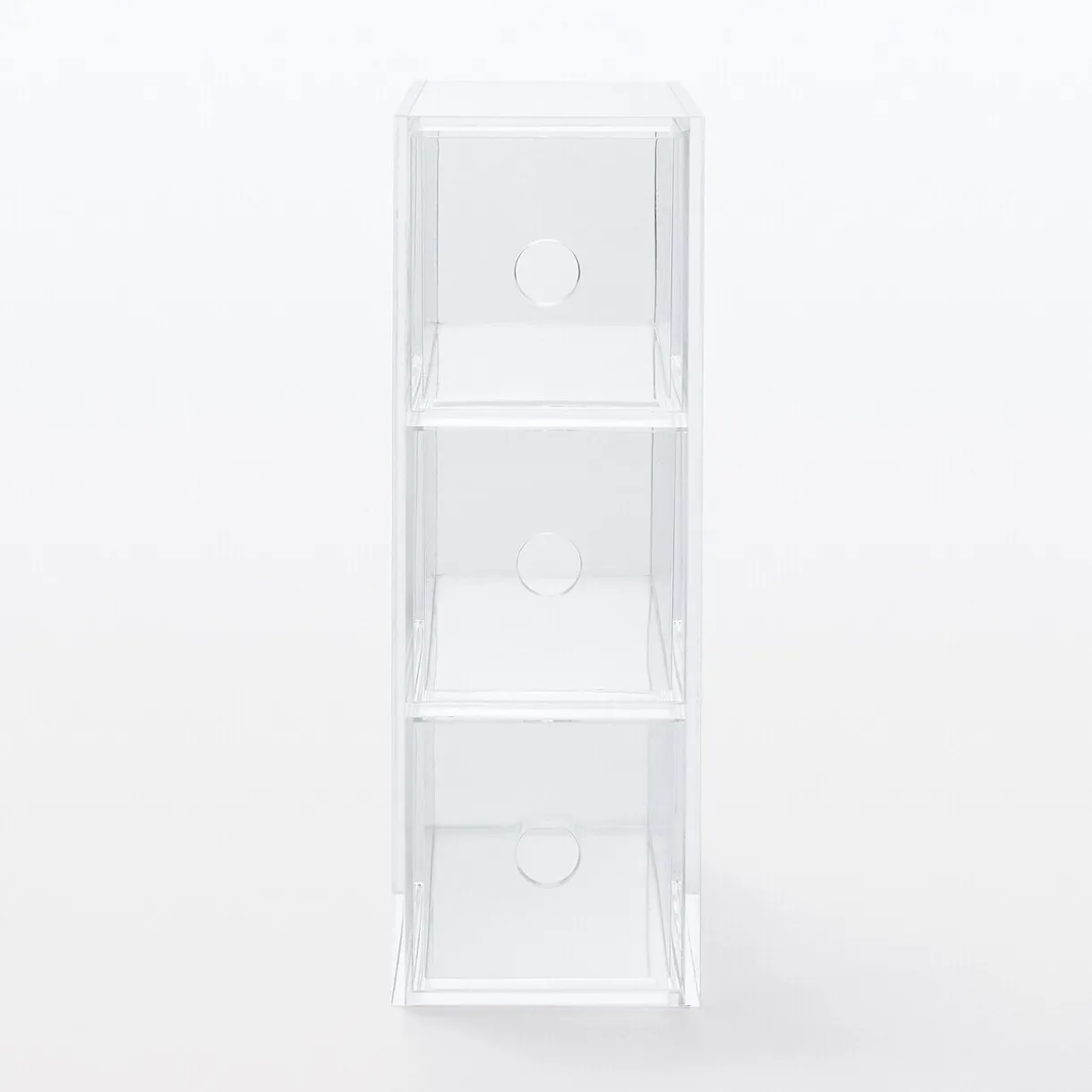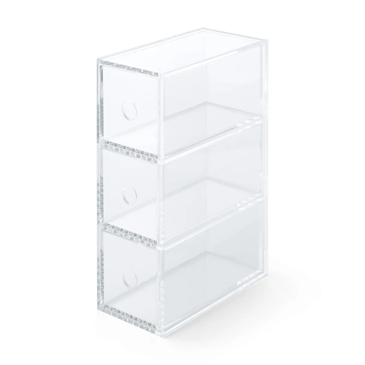 Compartiment en acrylique 3 tiroirs. Peut être utilisé verticalement ou horizontalement.Position verticale : largeur 8.6cm x longueur 17cm x hauteur 25.2cm.