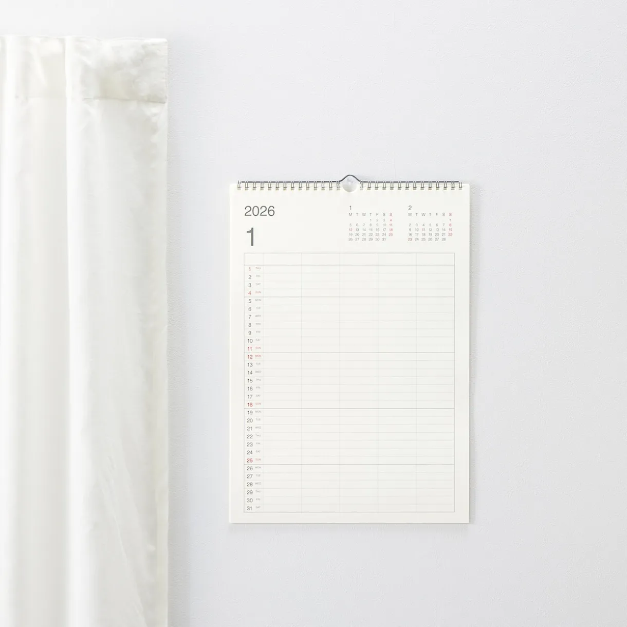 Tout le monde sur la même longueur d’onde. Un calendrier mural familial au format A3 fabriqué à partir de papier bagasse, un sous-produit de la canne à sucre. Il couvre la période de janvier à décembre 2026 et comporte cinq colonnes permettant de visualiser les emplois du temps de chacun en un seul coup d’œil. Il est livré avec un crochet pour l’accrocher au mur.