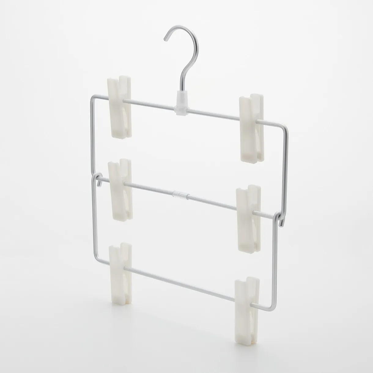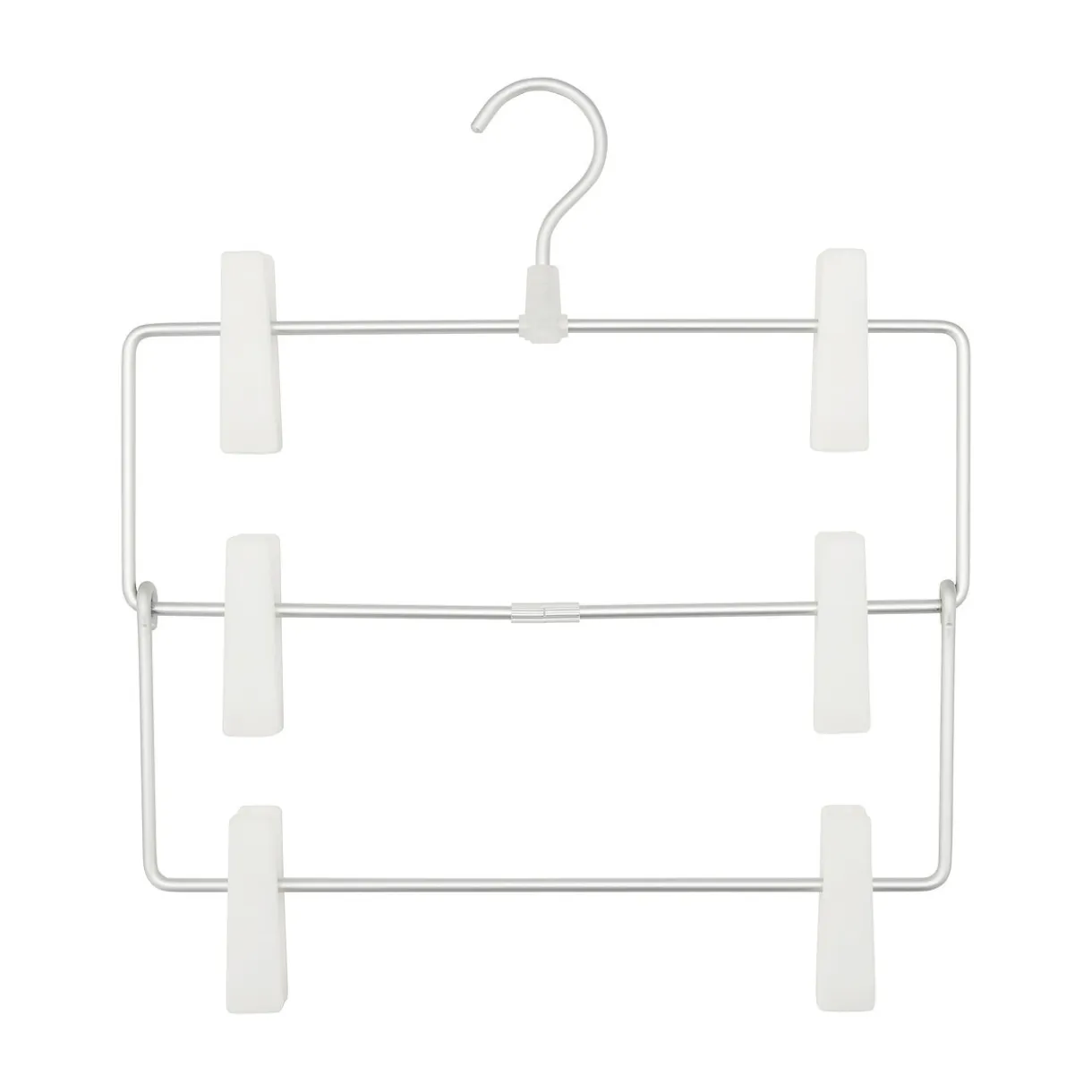 Ce cintre pratique permet de pendre 3 pièces au lieu d’une. Idéal pour pantalons, shorts et jupes.
