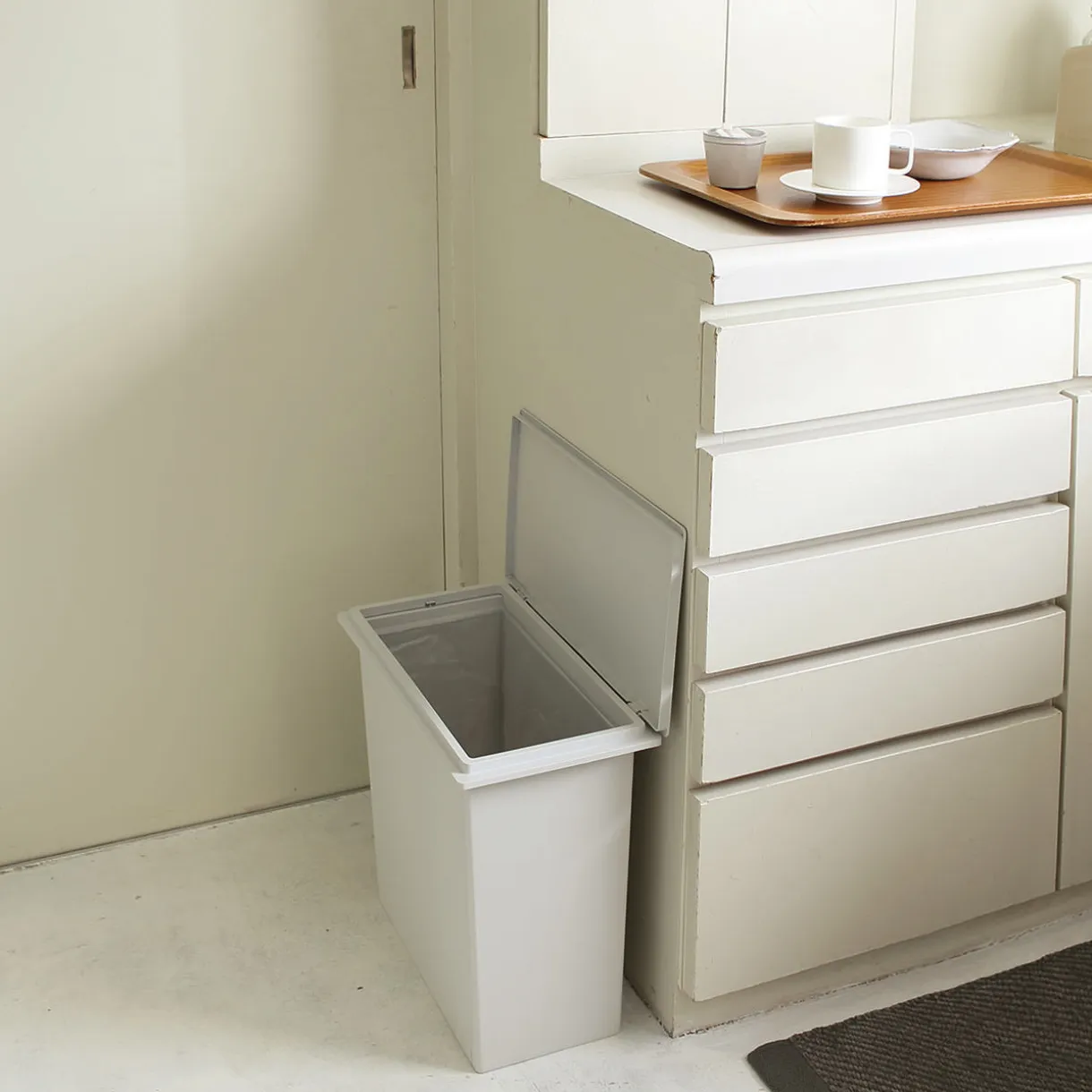 La largeur de cette poubelle est idéale pour les espaces étroits. Le couvercle est vendu séparément.